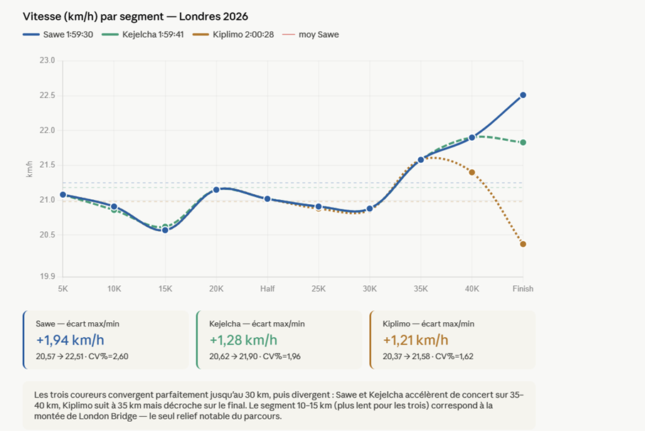 • Sawe (moy 21,25 > méd 21,05 km/h, CV% = 2,60%) : c’est le profil Billat le plus marqué. Légère décélération à 15 km, puis accélération progressive jusqu’à un sprint final à 22,51 km/h sur le dernier segment. Il court à 101,2% de sa vitesse critique — signe d’un engagement métabolique total, finement contrôlé.