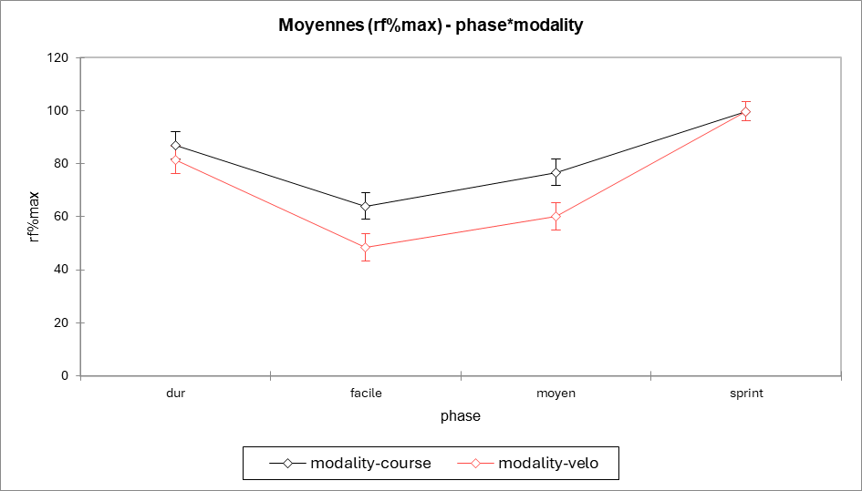 Rf plus élevée en course aux intensités basses et moyennes, rattrapée par le vélo en dur, égale au sprint.