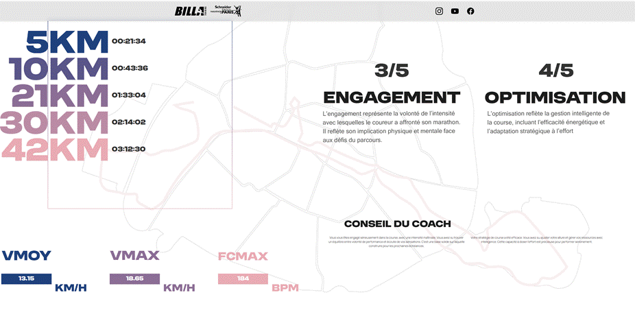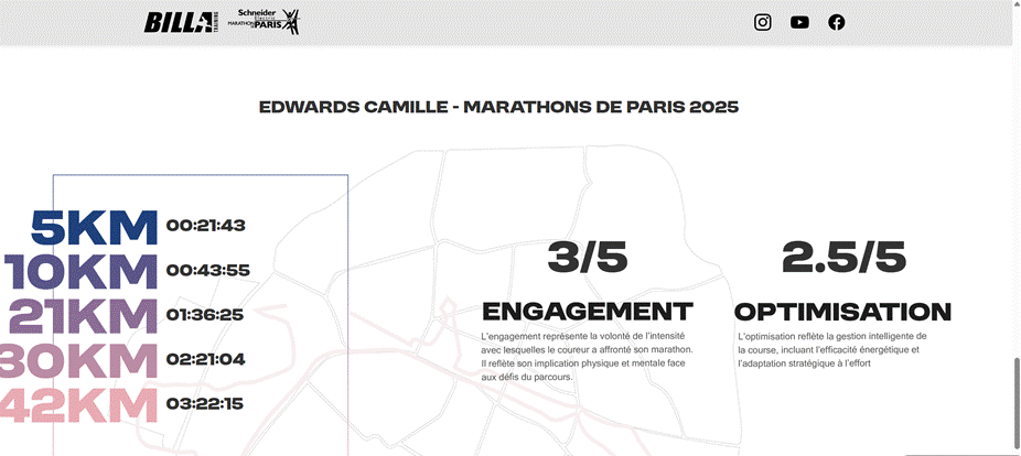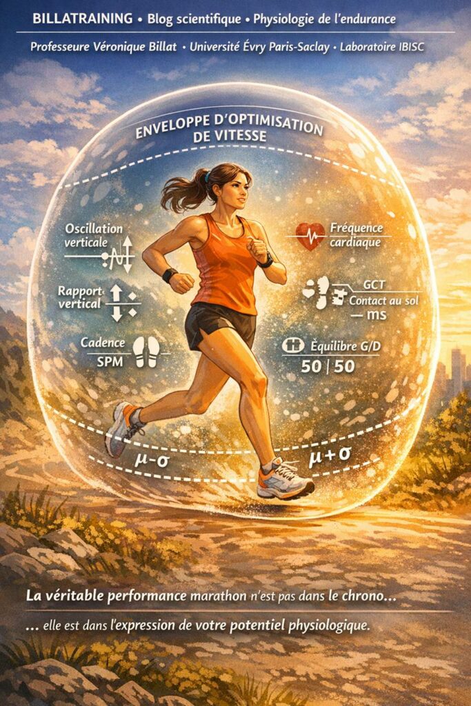 | RÉSUMÉ SCIENTIFIQUE La présente analyse repose sur deux études de cas issues du protocole BillaTraining. Elle soutient que la performance marathon ne peut être évaluée par le seul chronomètre, mais doit être définie comme l’expression complète du potentiel physiologique individuel du moment, tel que révélé par le test RABIT. Deux marqueurs clés sont proposés : l’enveloppe d’optimisation de vitesse (déterminée par le RABIT) et la stabilité des indicateurs biomécaniques (oscillation verticale, rapport vertical, cadence) comme mesure objective de la qualité de la performance. |