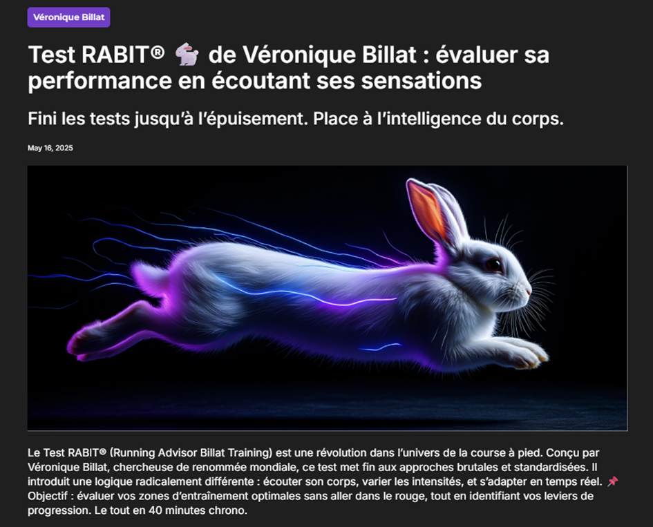 Mais le lapin (« Rabit » Running Advisor Billat Training) en 2019 et depuis on se reprend à espérer l’intégration d’une nouvelle ère de l’endurance humaine dès le plus jeune âge grâce à ces jeunes professeurs d’éducation physique et professeurs des écoles qui s’oriente vers un entraînement, un cycle d’endurance plus naturel, respectueux de la physiologie de l’enfant et de son goût pour des vitesses de course intermittentes et spontanée.