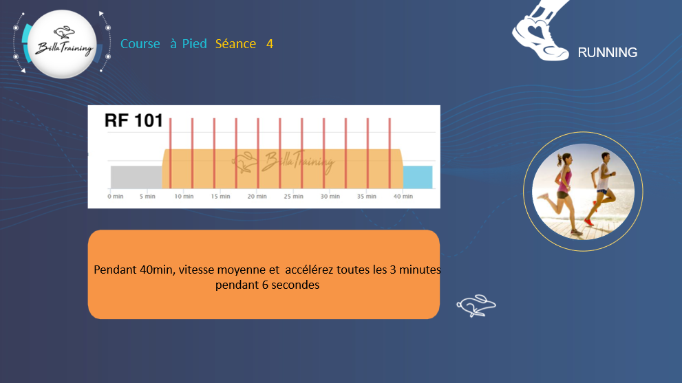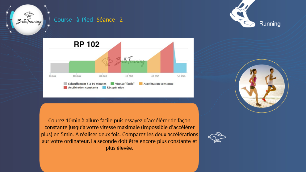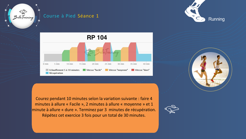 • Séance principale : Courir à une « allure facile » pendant 20 minutes, avec un sprint de 10 secondes toutes les 2 minutes.