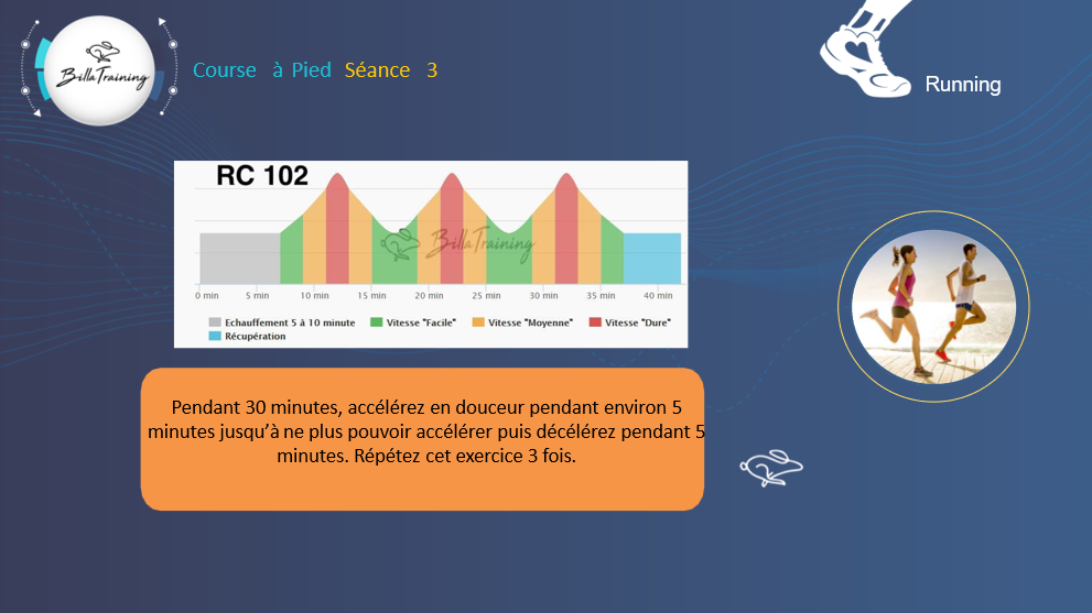 • 2 à 3 x (3 min à allure facile + 2 min à allure modérée + 1 min à allure soutenue) = 12 à 18 minutes