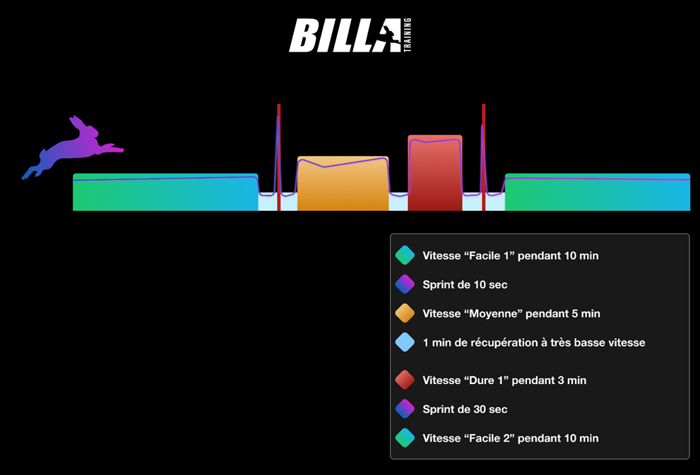 Engagement requisEngagement réel avec phases à intensité élevée (sprint 10s, 30s à allure très dure)Effort maximal jusqu’à épuisement demandé