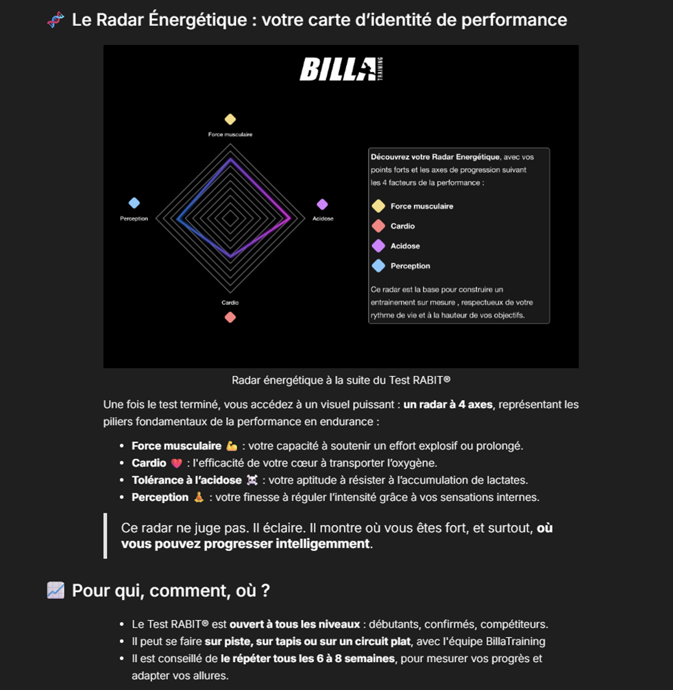 Mesure principaleProfil énergétique complet : force, résistance à l’acidose, efficacité cardiaque, perception de l’effortEstimation de la VMA et VO2max