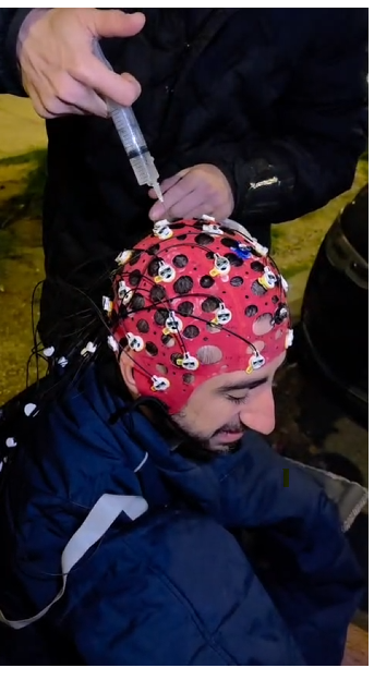 La photo circule. Un homme assis, tête baissée, un casque rouge couvert de capteurs en tous sens, une seringue s’approchant de son crâne sous les lumières de la nuit parisienne.