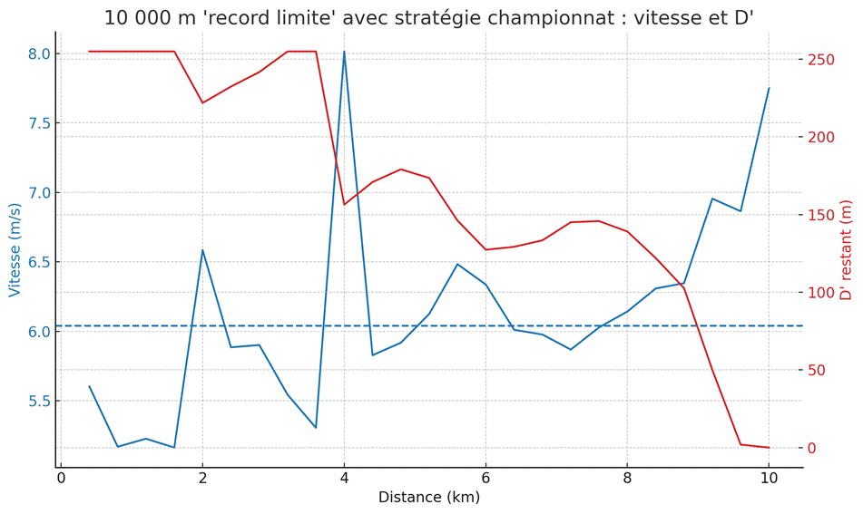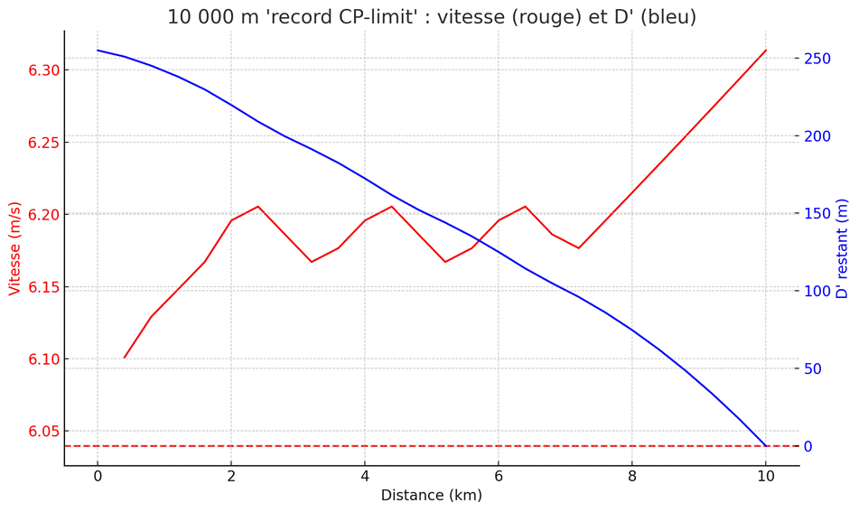 - Avec la stratégie de récupération du 10 000 m championnat, ton modèle CP+D′ donne un record théorique limite ≈ 27’30 ».