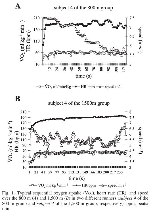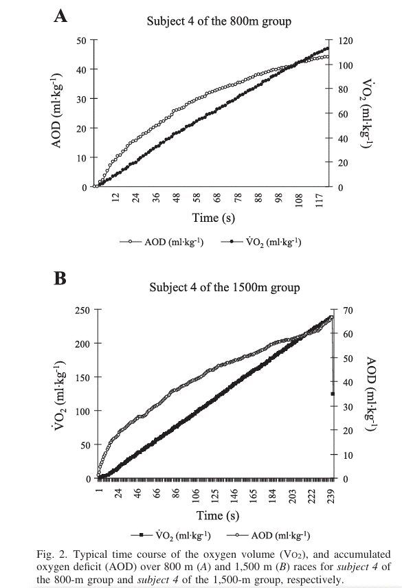 Si tu veux creuser et voir ce qu’il y a derrière ces notions de réserve anaérobie nous l’avons démontré en mesurant le déficit d’oxygène qui plafonne (épuisement des réserve anaérobie) de façon flagrante sur un 800 et 1500m dans un article publié dans le Journal of Applied Physiologie dont voici les figures clefs (une bonne image vaut mieux qu’un long texte !) : https://publications.billatraining.com/