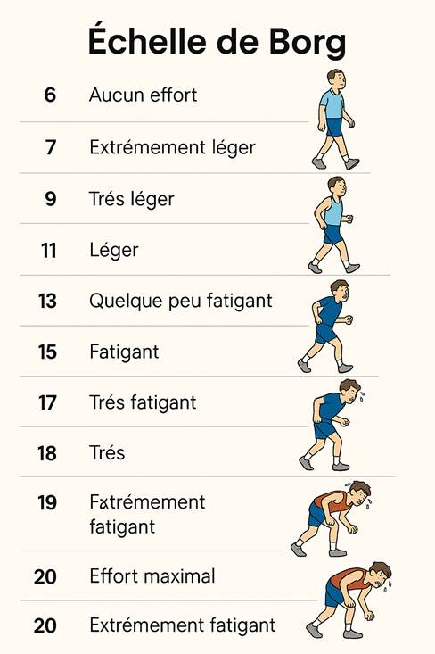 L’échelle de Borg permet d’évaluer l’effort perçu (RPE). Elle va de 6 (aucun effort) à 20 (effort maximal). C’est un outil précieux pour ajuster son intensité d’entraînement sans instrumentation.